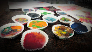 This is a very easy and simple project to do with your kids. It's a great process to do and very handy for those broken crayons laying around. All you have to do is just gather those crayons, tear off the wrappings, place into muffin cups lined with muffin sheets. Bake in an oven until melted, let cool, remove from muffin paper and color! Now I did this the hard and extremely messy way by chopping up the crayons into smaller pieces. I don't recommend doing this, but the reason why I did it was to have more colors in more cups. Doing this I noticed that when baking them, the smaller chunks would melt more quickly than the bigger chunks. I thought this left a really cool and interesting effect on the crayons. Some of them would have some texture to them, while others were smooth. I found that upcycling crayons is very good for little grasping toddler hands like my son "Green". Since he's new to holding pencils and normal crayons which tend to break and snap, using this shape is easier to grasp. It's good for practicing fine motor skills. The kids wanted to make some rainbow crayons and some solid color crayons, so these are what we came up with.
